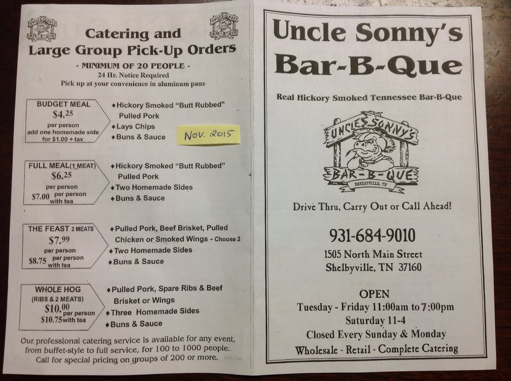 Welcome to Uncle Sonny's Bar B Que, your go-to destination for authentic Tennessee barbecue! Nestled at 1505 N Main St, Shelbyville, TN, Uncle Sonny’s offers a mouthwatering menu that’s sure to delight BBQ enthusiasts.